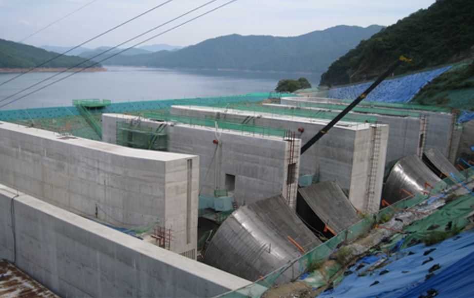 대단면 경사 수로터널 2련 공사, (단면 403m2(9분할), 구배 25%), 단면 변화식 라이닝폼 적용, 수문 WEIR 구조물, 가물막이 축조, 내부도로 6.8km
